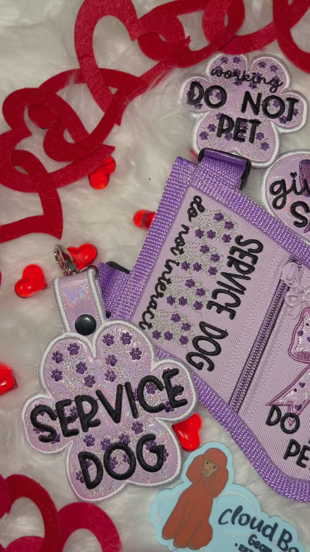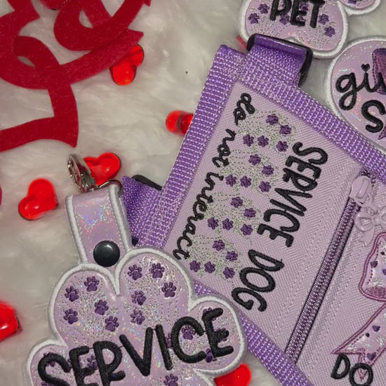 A soft lavender service dog set featuring elegant bow artwork, gentle purple tones, and clear working boundaries. Sweet, readable, and thoughtfully coordinated for handlers who prefer a calm, polished aesthetic.