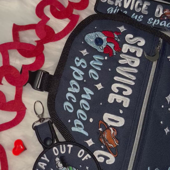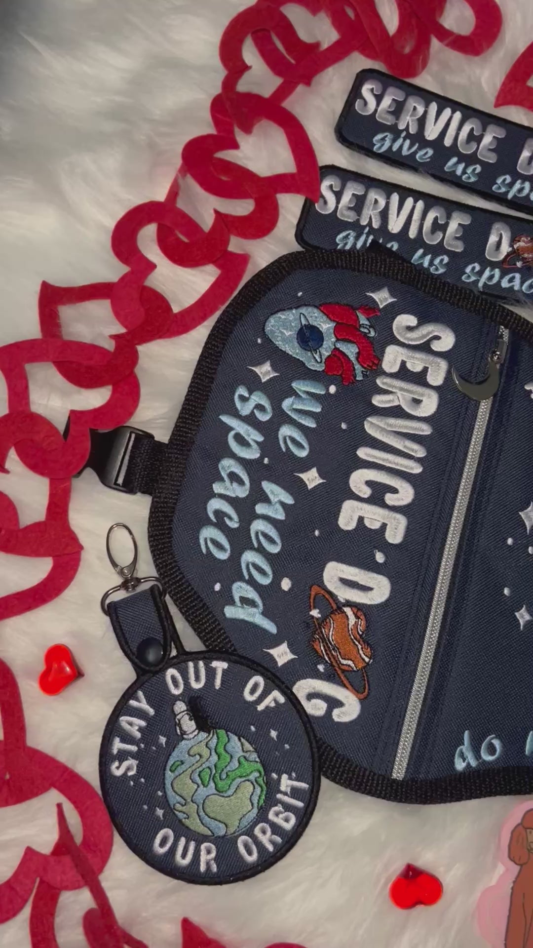 A cosmic, space-themed service dog set celebrating partnership, protection, and unwavering teamwork. Featuring planets, stars, and orbit-inspired messaging, this set pairs playful visuals with firm, readable working boundaries.